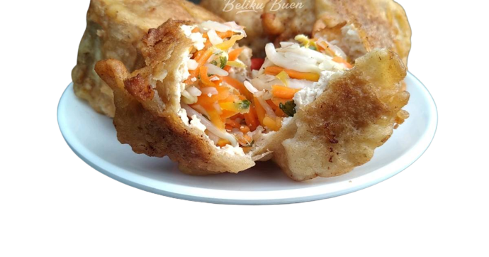 wrapping slices of ripe banana and sometimes jackfruit in spring roll wrappers, then deep-frying